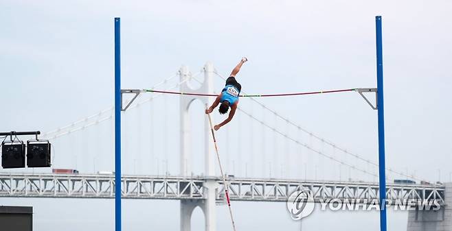 (부산=연합뉴스) 손형주 기자 = 19일 부산 수영구 광안리해수욕장에서 열린 부산 국제장대높이뛰기 U-20 부문에 출전한 이란의 야미라르샤 모사데기가 1차시기에 도전하고 있다. 2022.8.19