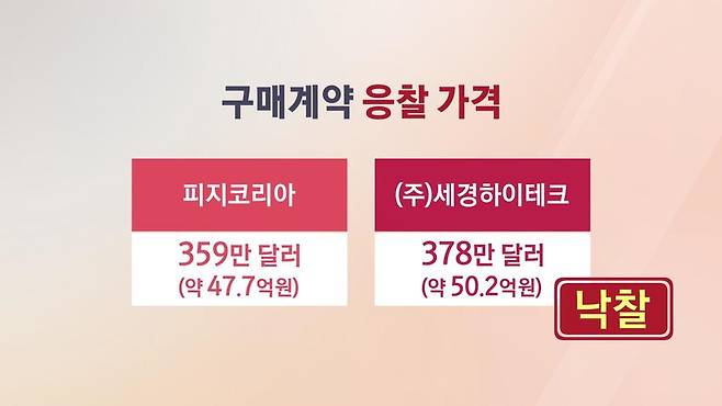 입찰 금액을 제시한 두 업체 가운데 359만 달러, 우리 돈 47억 7천만 원을 써낸 업체를 떨어뜨리고 이보다 3억 원 정도 더 비싼 50억 2천만 원을 써낸 업체를 낙점한 겁니다.