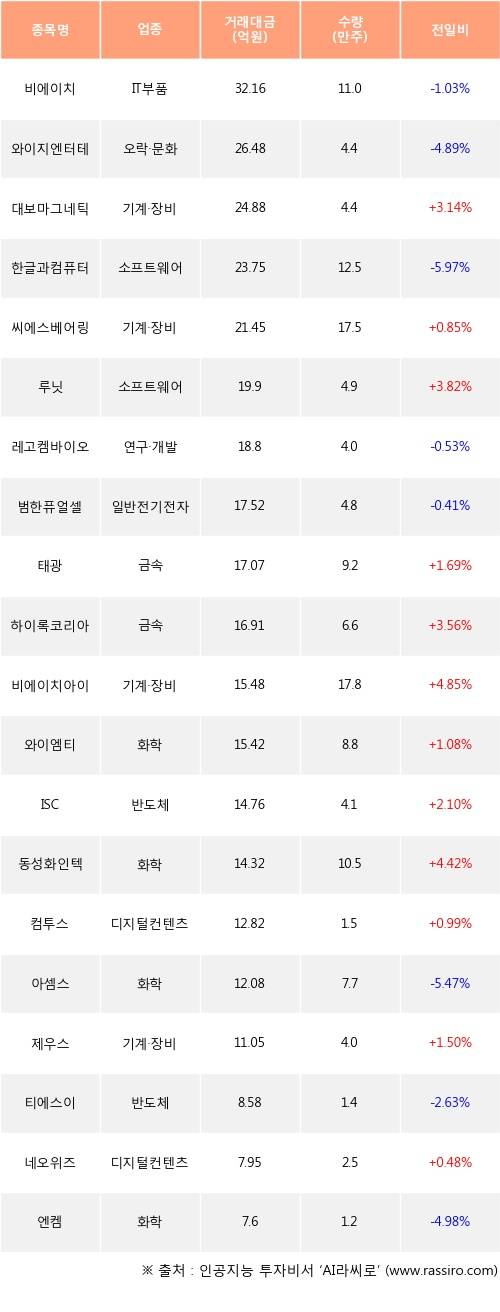 대보마그네틱, 씨에스베어링, 루닛 등은 전일 대비 주가가 상승했고, 비에이치, 와이지엔터테인먼트, 한글과컴퓨터 등은 주가가 하락했다.