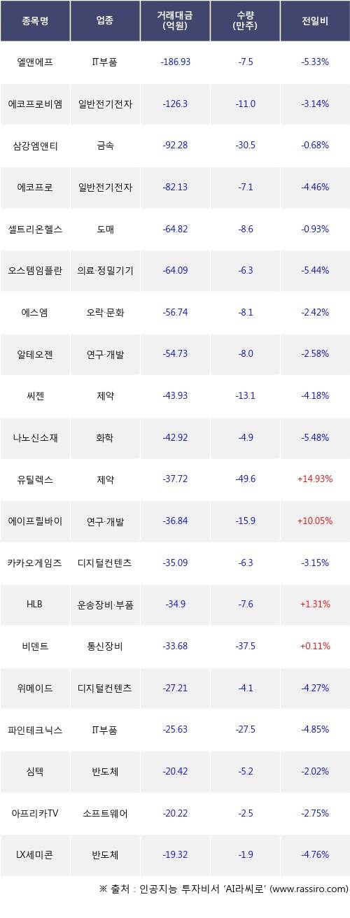 기관 투자자의 순매도 상위 20개 종목은 엘앤에프, 에코프로비엠, 삼강엠앤티, 에코프로, 셀트리온헬스케어, 오스템임플란트, 에스엠, 알테오젠, 씨젠, 나노신소재등이다.