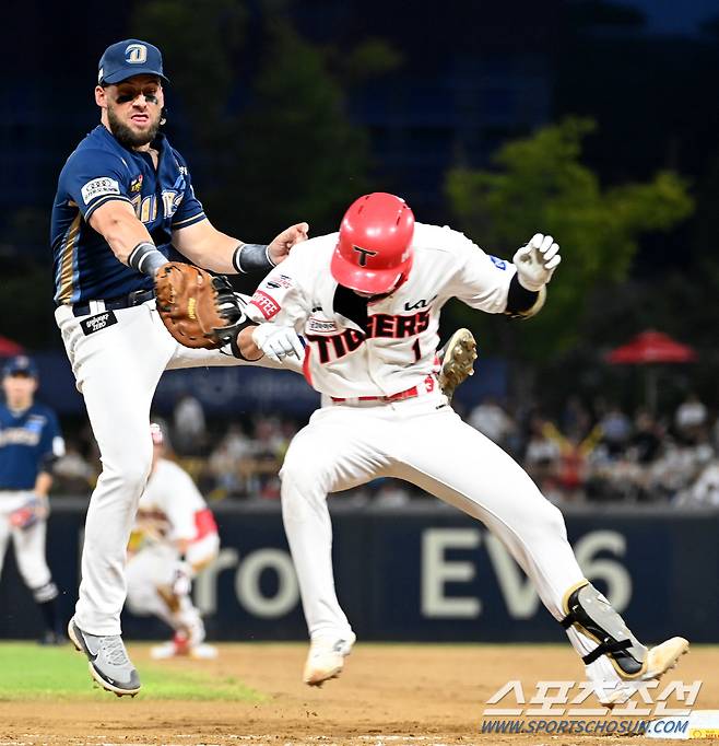 2022 KBO리그 NC 다이노스와 KIA 타이거즈의 경기가 19일 광주KIA챔피언스필드에서 열렸다. 3회말 무사 1루 KIA 박찬호가 3루땅볼을 치고 송구를 잡은 1루수 마티니의 태그를 피해 세이프되고 있다. 광주=허상욱 기자wook@sportschosun.com/2022.08.19/