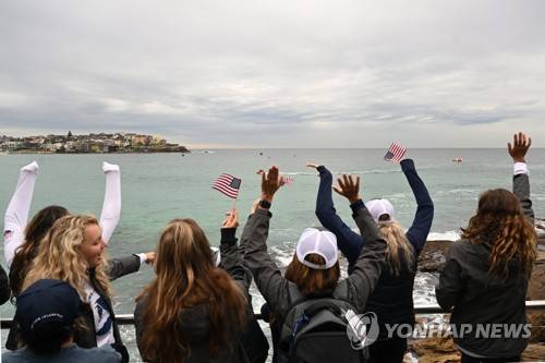 epa10128775 Members of Team USA cheer on their competitors during the 4 x 800m Open Water Relay between the Australian Dolphins and the USA on Day 1 of the Duel in the Pool 2022 at Bondi Beach in Sydney, Australia, 19 August 2022. EPA/DEAN LEWINS AUSTRALIA AND NEW ZEALAND OUT