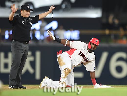 [마이데일리 = 광주 유진형 기자] KIA 소크라테스가 19일 오후 광주기아챔피언스필드에서 진행된 '2022 신한은행 SOL KBO리그' NC 다이노스와 KIA 타이거즈의 경기 3회말 2사 1.2루서 1타점 2루타를 친 뒤 기뻐하고 있다.