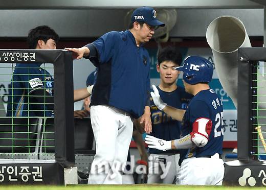 [마이데일리 = 광주 유진형 기자] NC 양의지가 19일 오후 광주기아챔피언스필드에서 진행된 '2022 신한은행 SOL KBO리그' NC 다이노스와 KIA 타이거즈의 경기 4회초 선두타자 홈런을 친 뒤 동료들의 축하를 받고 있다.