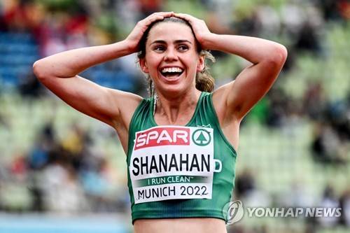 epa10128788 Louise Shanahan of Ireland reacts after winning the Women's 800 meters Semifinal during the Athletics events at the European Championships Munich 2022, in Munich, Germany, 19 August 2022 EPA/FILIP SINGER