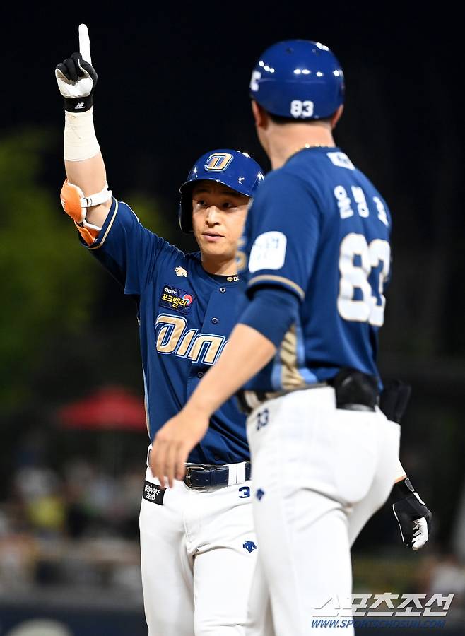 2022 KBO리그 NC 다이노스와 KIA 타이거즈의 경기가 19일 광주KIA챔피언스필드에서 열렸다. 4회초 2사 만루 NC 손아섭이 2타점 적시타를 치고 기쁨을 나누고 있다. 광주=허상욱 기자wook@sportschosun.com/2022.08.19/