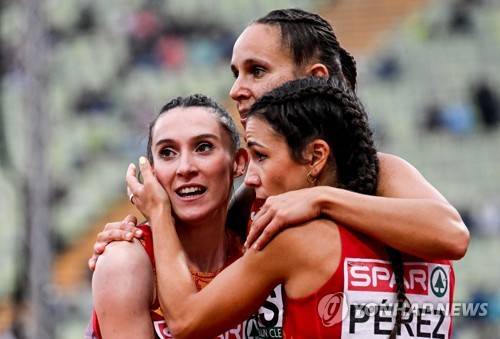 epa10128816 Team Spain reacts after the Women's 4x400 meters Relay Heat during the Athletics events at the European Championships Munich 2022, in Munich, Germany, 19 August 2022. EPA/FILIP SINGER