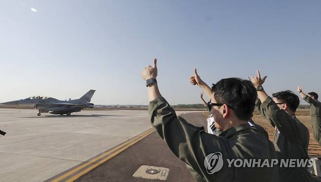 (서울=연합뉴스) 대규모 다국적 연합훈련인 피치 블랙 훈련에 최초로 참가하는 공군의 제19전투비행단 KF-16 전투기가 19일(현지시간) 호주 다윈 공군 기지에 착륙하고 있다.