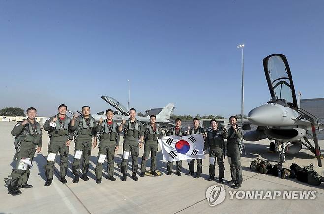 (서울=연합뉴스) 대규모 다국적 연합훈련인 피치 블랙 훈련에 최초로 참가하는 공군 제19전투비행단 전투기 조종사들이 19일(현지시간) 호주 다윈 공군 기지에 도착한 뒤 기념촬영을 하고 있다.