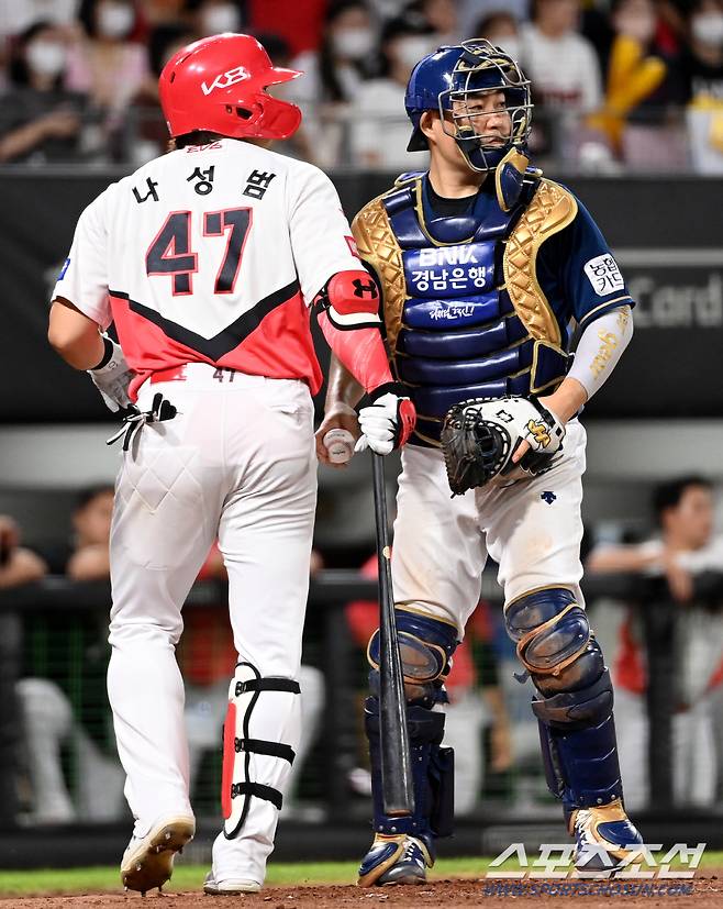 2022 KBO리그 NC 다이노스와 KIA 타이거즈의 경기가 19일 광주KIA챔피언스필드에서 열렸다. 7회말 1사 1,2루 KIA 나성범이 NC 류진욱에 삼진으로 물러나고 있다. NC 포수는 양의지. 광주=허상욱 기자wook@sportschosun.com/2022.08.19/