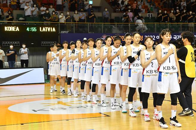 [서울=뉴시스] 이영환 기자 = 19일 오후 청주체육관에서 열린 KB국민은행 초청 2022 여자농구 국가대표 평가전 대한민국과 라트비아의 경기, 대한민국 선수들이 국민의례를 하고 있다. (사진=대한민국농구협회 제공) 2022.08.19. photo@newsis.com *재판매 및 DB 금지