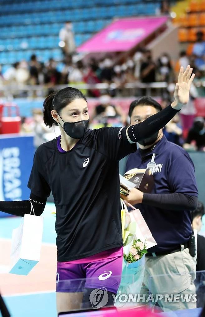 (순천=연합뉴스) 천정인 기자 = 흥국생명 김연경 선수가 19일 전남 순천시 팔마체육관에서 열린 2022 순천·도드람컵 프로배구대회 여자부 준결승 한국도로공사와의 경기를 마치고 팬들에게 인사하고 있다. 2022.8.19