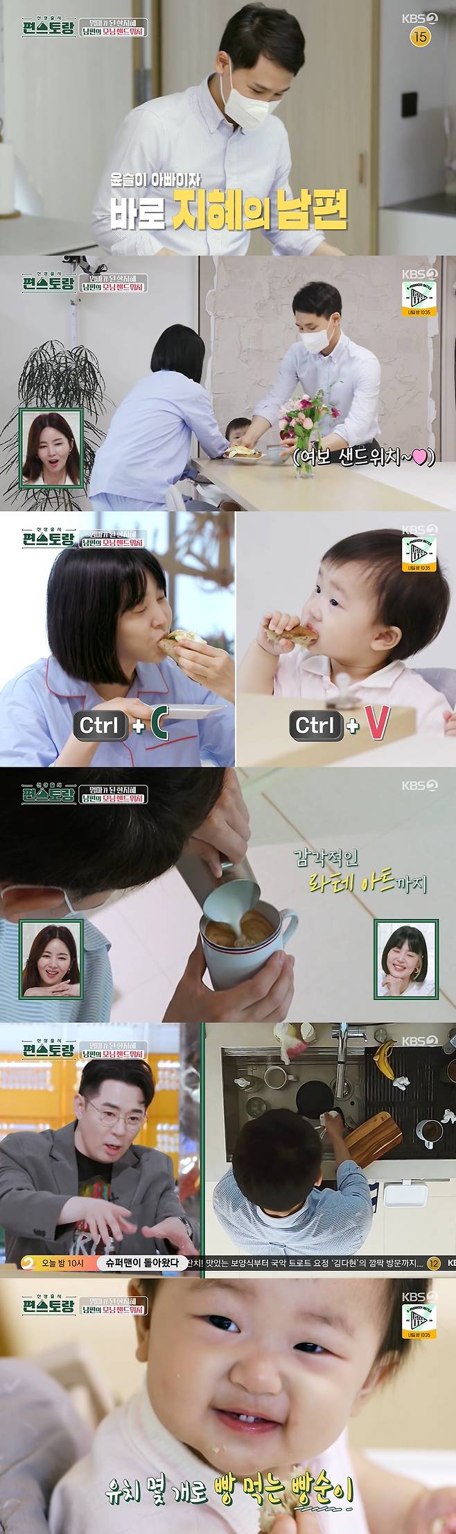 한지혜가 윤슬 양과 놀아주는 시간, 부엌에서는 정장을 차려입은 남편이 샌드위치 만들기에 집중하고 있었다. 평소 요리를 자주 하는 편이라고. 남편은 섬세한 손놀림으로 아보카도에 달걀 프라이, 잼 등을 이용해 모닝 샌드위치를 가볍게 완성했다. 한지혜는 남편 표 샌드위치를 먹더니 "샌드위치가 너무 정체불명인데?"라고 물으며 웃음을 터트렸다. 이어 "방송 나가면 맨날 이렇게 해주는 줄 알겠다"라고 한 번 더 농을 던졌지만 이내 "맛있다"고 감탄해 웃음을 자아냈다.
