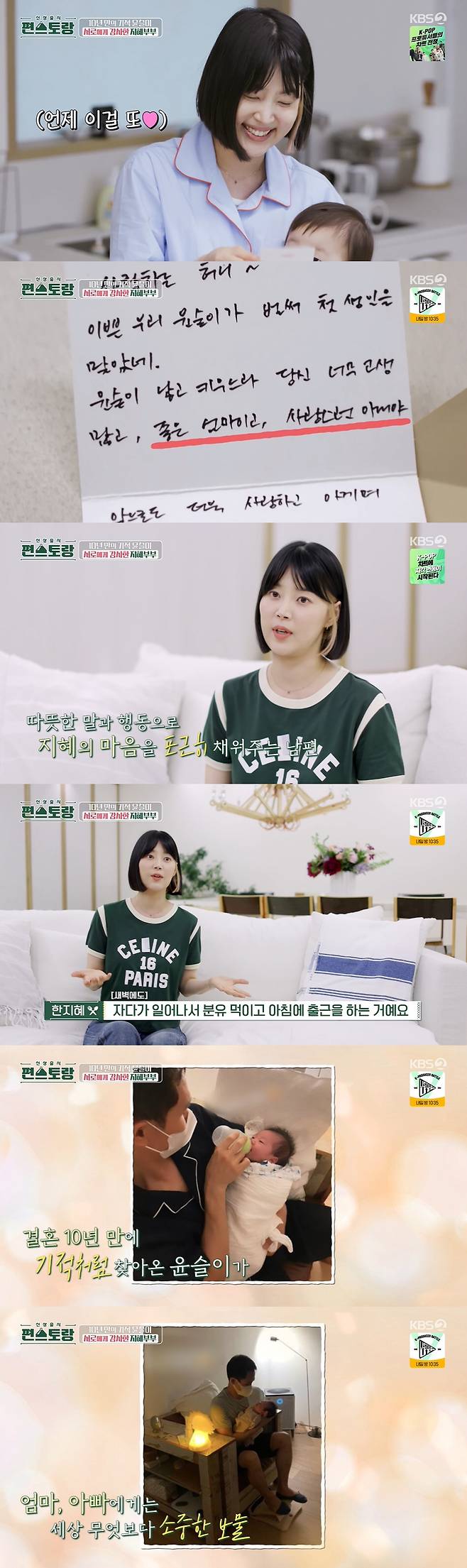 한지혜는 이후 남편이 몰래 남기고 간 손 편지를 발견하고 환하게 웃었다. "딸 낳고 키우느라 당신 너무 고생 많고 좋은 엄마이고 사랑스러운 아내야. 오늘 더 사랑해"라는 내용이 담겨 한지혜는 감동했다. 한지혜는 "남편이 선물을 해주거나 꽃을 사주는 이벤트를 많이 해주는 편은 아니다. 근데 살면서 말로 상처받은 적은 없다. 저는 그런 부분에서 마음이 채워진다. 아이를 낳고 5개월 동안 남편이 분유를 타서 3~4시간에 한 번씩 자다 일어나 아이를 먹이고 출근을 했다. 몇 개월을 하더니 탈모가 왔더라"라며 고마움을 전했다.