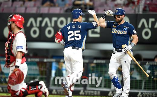 [마이데일리 = 광주 유진형 기자] NC 양의지가 19일 오후 광주기아챔피언스필드에서 진행된 '2022 신한은행 SOL KBO리그' NC 다이노스와 KIA 타이거즈의 경기 4회초 선두타자 홈런을 친 뒤 마티니의 축하를 받고 있다.