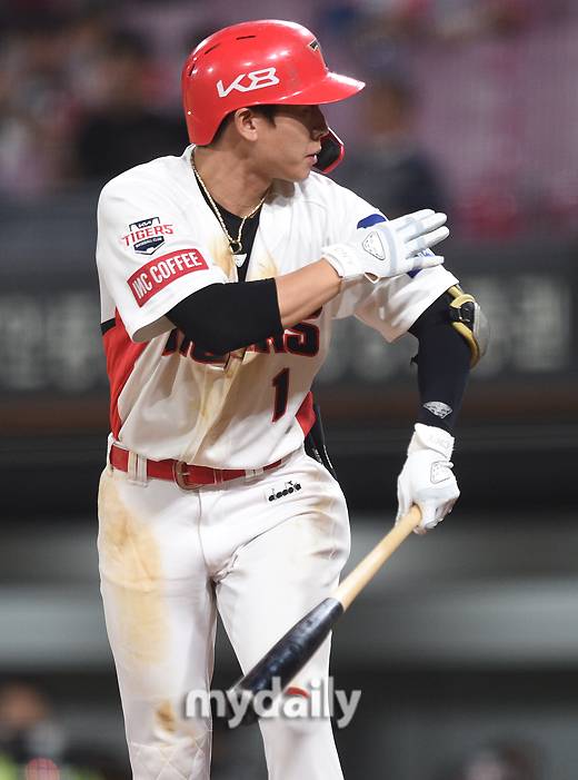 [마이데일리 = 광주 유진형 기자] KIA 박찬호가 19일 오후 광주기아챔피언스필드에서 진행된 '2022 신한은행 SOL KBO리그' NC 다이노스와 KIA 타이거즈의 경기 10회말 2사 1루서 몸에 맞는 공을 어필하고 있다.