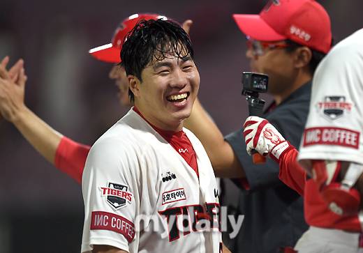 [마이데일리 = 광주 유진형 기자] KIA 이창진이 19일 오후 광주기아챔피언스필드에서 진행된 '2022 신한은행 SOL KBO리그' NC 다이노스와 KIA 타이거즈의 경기 10회말 1사 1.2루서 끝내기 3점홈런을 친 뒤 기뻐하고 있다.
