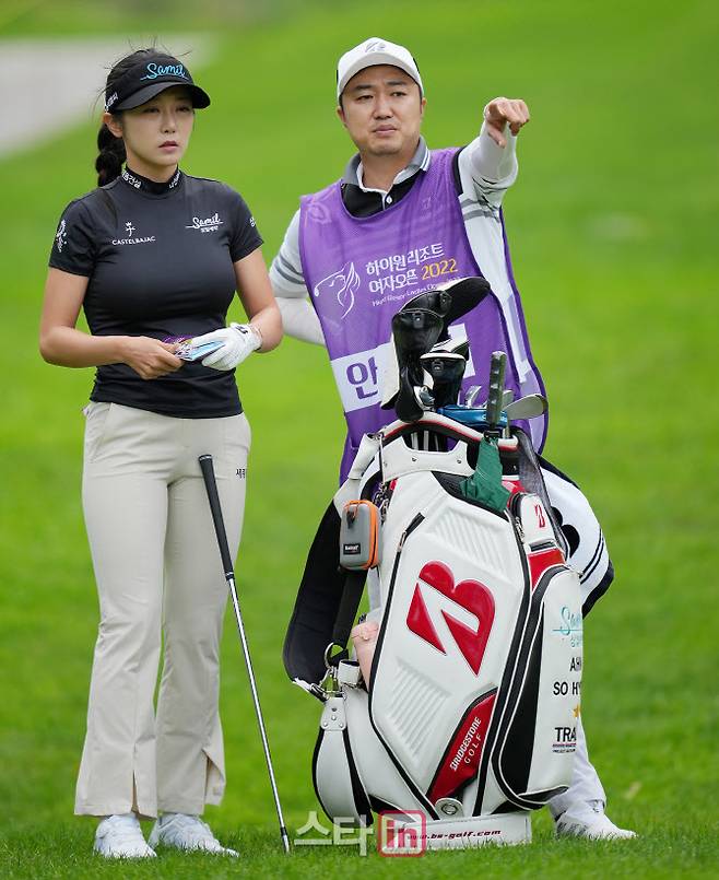 [포토]안소현 '콤비 캐디와 공략을 상의한다'