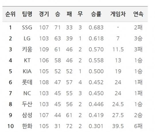 [19일 팀 순위]kt, 롯데에 전날 패배 되갚고 3위 키움에 1.5게임로 턱밑가지 따라붙어..KIA, NC에 극적 역전승으로 6위와 5게임차 5위자리 지켜내