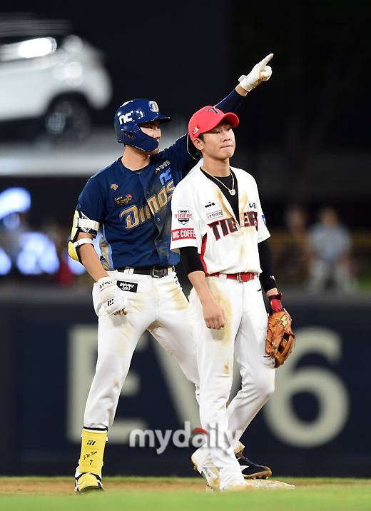 [마이데일리 = 광주 유진형 기자] NC 김주원이 19일 오후 광주기아챔피언스필드에서 진행된 '2022 신한은행 SOL KBO리그' NC 다이노스와 KIA 타이거즈의 경기 9회초 2사 1.2루서 1타점 적시타를 친 뒤 기뻐하고 있다.