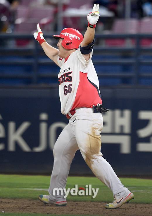 [마이데일리 = 광주 유진형 기자] KIA 이창진이 19일 오후 광주기아챔피언스필드에서 진행된 '2022 신한은행 SOL KBO리그' NC 다이노스와 KIA 타이거즈의 경기 10회말 1사 1.2루서 끝내기 3점홈런을 친 뒤 기뻐하고 있다.