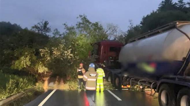 산에서 쏟아진 토사와 나무가 고속도로를 완전히 덮었습니다.