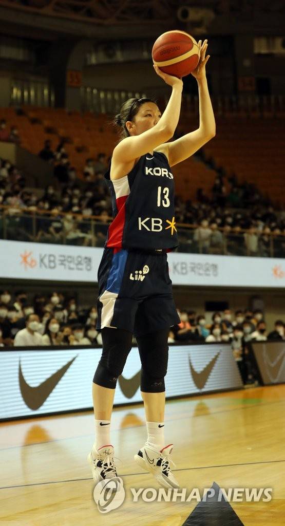 (청주=연합뉴스) 천경환 기자 = 20일 충북 청주체육관에서 열린 한국 여자농구 대표팀과 라트비아 대표팀의 친선경기. 양인영 선수가 중거리 슛을 던지고 있다. 2022.8.20