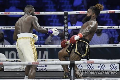 Andrew Tabiti of the United States, left, lands a blow on James Wilson of the United States during their heavyweight boxing fight at King Abdullah Sports City in Jeddah, Saudi Arabia, Saturday, Aug. 20, 2022. (AP Photo/Hassan Ammar)