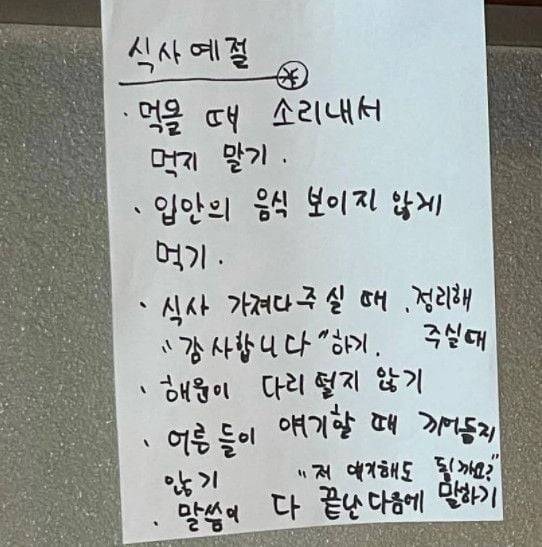 정 부회장은 지난해 말 "3호, 4호(자녀)뿐만 아니라 우리가 모두 알아야 할 메시지"라는 글과 함께 '식사 예절'이라고 적힌 쪽지를 공개했다. 여기에는 '먹을 때 소리 내서 먹지 말기', '입안의 음식 보이지 않게 먹기', '식사 가져다주실 때, 정리해 주실 때 감사하다고 말하기', '다리 떨지 않기', '어른들이 얘기할 때 끼어들지 않기', 말씀이 다 끝난 다음에 말하기' 등이 포함돼 있었다.