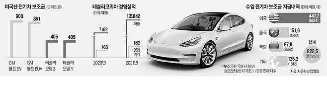 테슬라 등 미국산 전기차가 우리 정부의 수입 전기차 보조금 중 절반 이상을 쓸어가고 있는 것으로 나타났다.