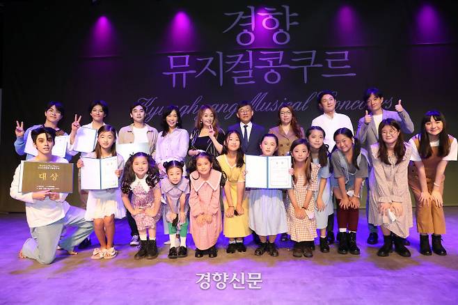 제5회 경향뮤지컬콩쿠르 본선과 시상식이 20일 서울 중구 경향아트힐에서 열렸다. 이날 본선에는 개인과 단체 총 464개팀 가운데 예선을 통과한 48개팀이 경연을 펼쳤다. 대상은 뮤지컬 <데스노트>의 ‘변함없는 진실’로 무대를 꾸민 박경호(앞줄 왼쪽 첫번째)가 차지했다. 최우수상은 서율아(초등부), 김민기(고등부), 한승엽(대학·일반부), 유지호 외 9명(초·중·고 단체)이, 배우 카이 장학금이 주어지는 특별상은 임수준이 수상했다. 우수상을 포함한 수상자들이 김석종 경향신문 사장(뒷줄 오른쪽에서 네번째), 심사위원들과 기념사진을 찍고 있다.