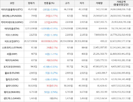 가상화폐 시세 (제공: 암호화폐 거래소 업비트)현재 암호화폐 거래소 "업비트"에 따르면 가상화폐 대장 격인 비트코인의 시세는 전일 대비 68,000원(0.23%) 상승한 29,527,000원에 거래되고 있다.