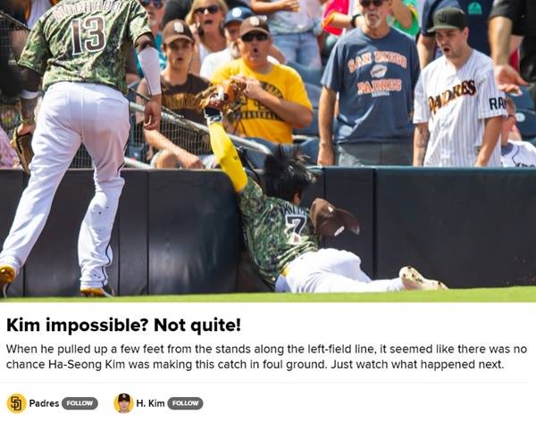 샌디에이고 감독과 동료 선수들도 찬사를 쏟아냈다. 밥 멜빈 샌디에이고 감독은 "(펜스와 충돌할 때) 김하성의 몸이 반으로 잘려 나가는 줄 알았다"라며 부상을 당했을까 걱정했던 심정을 털어놓았다.