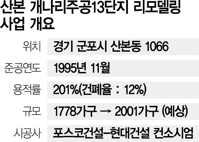 개나리주공13단지는 지난해 말 포스코건설-현대건설 컨소시엄을 시공사로 선정했다. 리모델링 사업이 완료되면 현재 1778가구 규모인 개나리주공13단지는 220여 가구가 늘어나 2000가구가 넘는 대단지로 탈바꿈한다. 개나리주공13단지 리모델링 조합 관계자는 “리모델링 안전진단에서 B등급을 받은 것은 산본 내에서 개나리13단지가 유일한 만큼 리모델링을 빠르게 추진할 수 있는 초석이 마련됐다”며 “기존 용적률도 201%로 낮아서 주택법에 따른 리모델링 용적률 상향률(기존 전용면적 용적률의 30~40%)을 적용하더라도 군포시 지구단위계획 허용 용적률인 300%보다 낮기 때문에 사업 추진이 비교적 수월하다”고 설명했다.