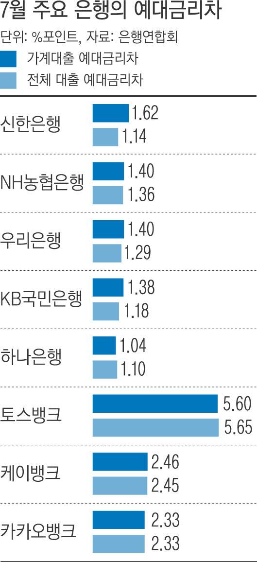 인터넷전문은행 중에선 토스뱅크의 가계대출 예대금리차가 5.60%포인트로 가장 컸다. 이어 케이뱅크(2.46%포인트), 카카오뱅크(2.33%포인트) 순이었다.