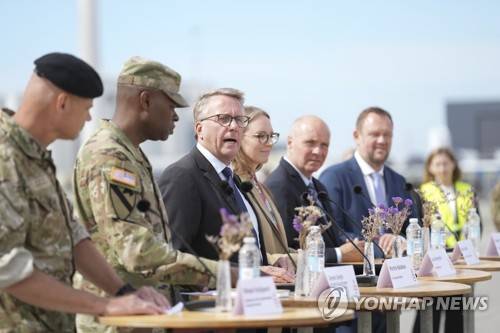 epa10133515 Major General James M. Smith, Commanding General of the US army, second left, and Denmark's Minister of Defense Morten Boedskov, third left, during a joint press conference on the expansion of Esbjerg Harbor in Denmark, 22 August 2022. The port is to be expanded to be "able to receive a brigade of NATO forces in a shorter time than before," the Danish defense ministry said. The intention is to deepen the channel to 12.5 meters and establish the necessary reception facilities for allied forces in the harbor. EPA/Claus Fisker DENMARK OUT