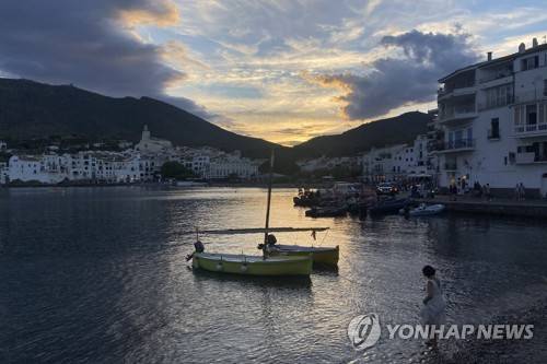 A woman paddles in the sea as the sun goes down in the port of Cadeques in Spain, Sunday Aug. 21, 2022. (AP Photo/Tony Hicks)