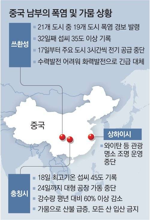 인구가 각각 8400만 명과 3000만 명인 쓰촨성과 충칭은 전력의 약 80%를 수력발전으로 충당한다. 그러나 최근 폭염과 가뭄으로 곳곳의 강과 저수지 바닥이 드러나면서 수력발전이 불가능해졌다. 당국이 화력발전을 긴급히 늘려 부족한 전력을 메우려 하고 있지만 인구 및 산업 밀집 지역인 데다 냉방 수요가 많은 여름철이라 치솟는 전기 수요를 감당하기 어려운 형편이다.