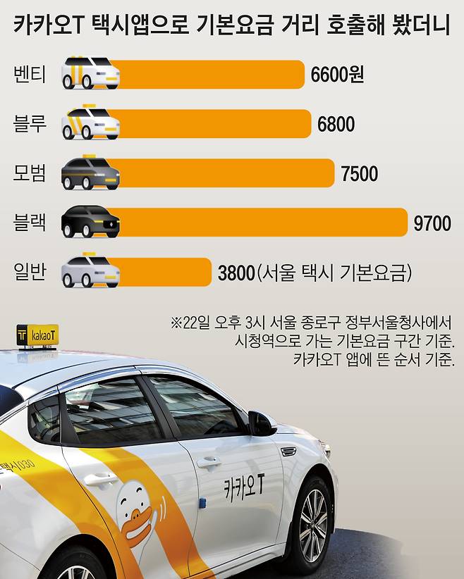 카카오택시는 직접 운영하는 카카오T 블루를 부를 때 거리나 호출 시간과 상관없이 최대 3000원의 호출비를 받는다. 서울의 택시 기본요금은 2019년 2월 3800원으로 800원 인상되고 나서 3년 8개월 동안 그대로인데, 일반 택시와 똑같지만 ‘블루’라는 이름이 붙으면 기본 요금이 6800원이 되는 셈이다. 호출비는 카카오택시 운영사인 카카오모빌리티와 택시 회사가 절반씩 가져간다. 카카오택시는 블루보다 더 높은 요금을 받는 대형 택시인 벤티, 고급형 택시인 블랙 등도 운영하고 있다.