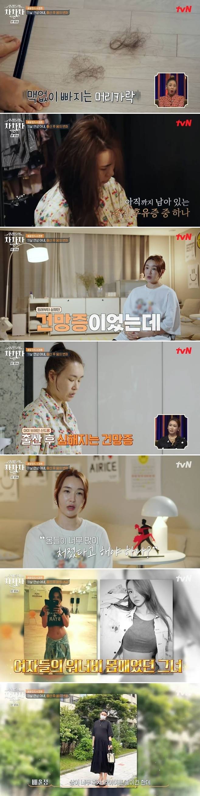 "출산 후 몸에 온 변화가 뭐냐"는 질문에 배윤정은 "머리부터 발 끝까지"라며 "원래 건망증이 심했는데, 주방에 왜 들어왔는지 기억이 안 날 정도"라고 털어놨다. 또 독박 육아 때문에 본인이 모성애가 없는지도 걱정될 정도라는 배윤정은 "아기가 울 때는 '언제까지 우나 보자' 할 때도 있다"고 고백했다.