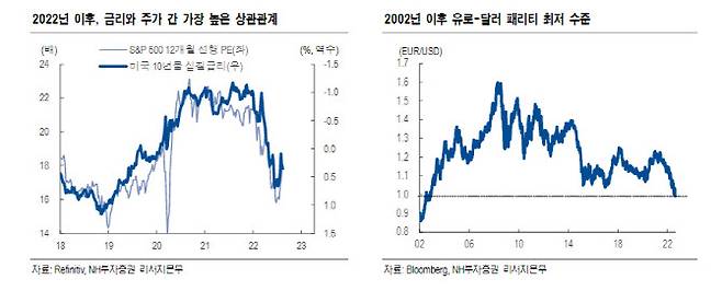 다만 미국 주당순이익(EPS) 전망치는 지속적으로 하향 조정되는 가운데 2022년 이익전망치는 전년대비 3%, 2023년은4% 증가에 불과한 상황이다. 여기에 물가 지표의 하락 속도가 예상보다 느릴 경우 이는 더 공격적인 긴축에 따른 경기침체 우려를 높일 것으로 전망했다.