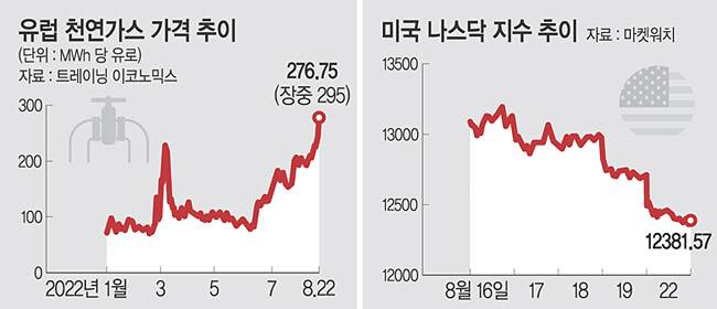 22일(현지시간) 외신에 따르면 가장 큰 문제는 유럽 에너지 대란이다. 특히 이날 네덜란드 TTF 거래소에서 천연가스 가격은 장중 메가와트시(㎿h)당 전 거래일보다 20.6% 뛴 295유로(약 39만2400원)까지 치솟았다. 이는 우크라이나 전쟁 개전 직후인 3월 초 300유로 이후 최고치며 1년 전 26유로에 비하면 1000% 이상 뛴 수준이다. 특히 유럽 고에너지 가격은 물가 전반에 직격탄을 날리고 있다. 이날 씨티은행은 내년 1월 영국의 물가상승률을 1976년 석유파동 이후 최대치인 18.6%로 예상하며 내년 영국의 에너지 요금 상한선을 5816파운드(약 921만 원)까지 내다봤다.