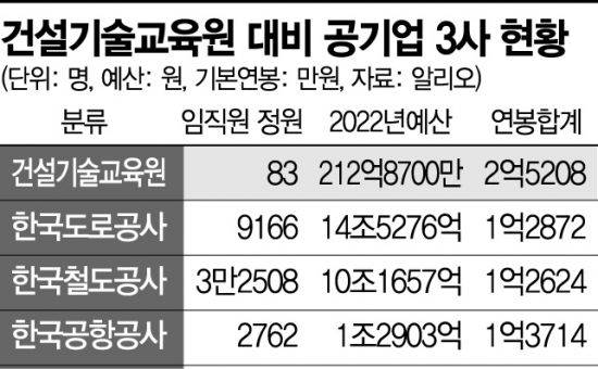 23일 국회 국토교통위원회 소속 강대식 국민의힘 의원실이 분석한 자료에 따르면 건설기술교육원장의 올해 기본연봉은 2억5208만원이다. 이는 국토부 산하 다른 대형 공공기관장들과 비교해도 2배 이상에 달한다. 한국도로공사 사장 연봉은 1억2872만원, 한국철도공사는 1억2625만원, 한국공항공사의 경우에도 1억3714만원이다. 건설기술교육원 예산은 도로공사 예산 대비 0.15%규모인 210여억원이지만 연봉은 도로공사 사장보다 1억2300여만원 더 많다. 조직 규모로 보더라도 한국철도공사 임직원 규모가 3만2500여명인데 반해 건설기술교육원은 83명에 불과하다.