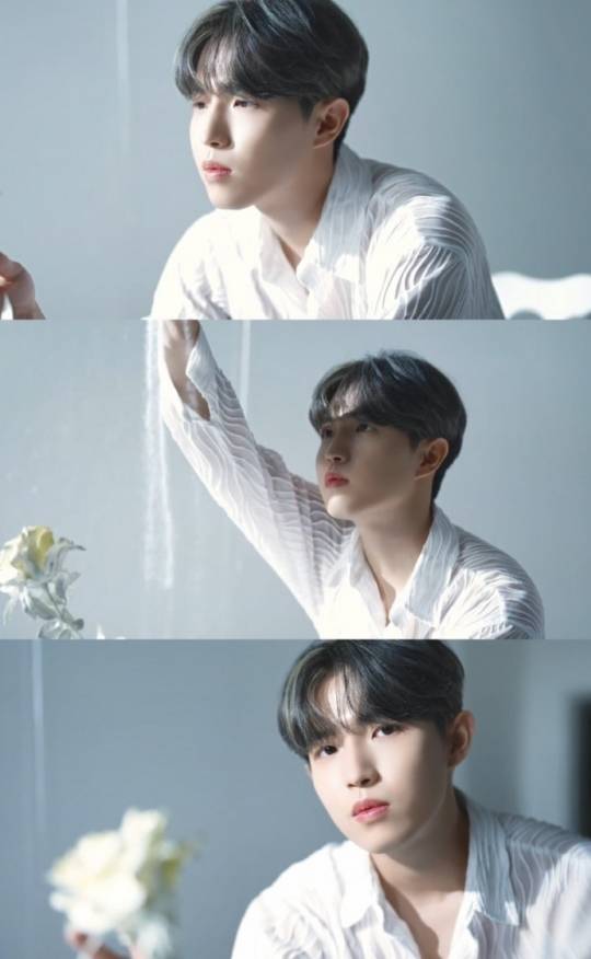 공개된 영상 속 김재환은 흰색 장미가 놓여있는 테이블 앞에 앉아 있는 모습이다. 흰색 셔츠와 정장 바지로 깔끔한 스타일을 연출한 김재환은 장미를 유심히 바라보며 그윽한 눈빛을 발산했다.