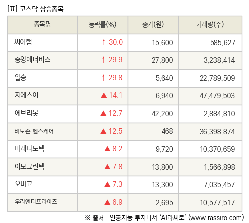 [fnRASSI]장마감, 코스닥 상승 종목(씨이랩 30.0% ↑)