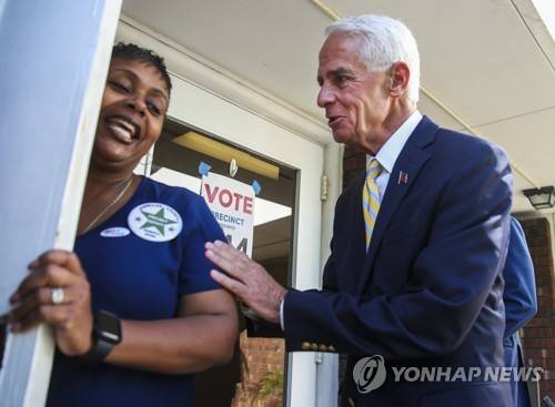 Poll worker Patrice Perry, a volunteer, is greeted by U.S. Rep. Charlie Crist as he enters the polls to vote in person on Election Day at Gathering Church on Tuesday, Aug. 23, 2022 in St. Petersburg, Fla. Crist is running for Florida Governor against Agriculture Commissioner Nikki Fried in the primary election. (Dirk Shadd/Tampa Bay Times via AP) MANDATORY CREDIT