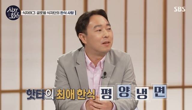 최태원 단장이 “옥류관 냉면을 드신 거냐”고 묻자 핫타 야스시는 “옥류관도 먹었고 고려호텔 1층에서 먹었는데 개인적으로 옥류관보다 고려호텔이 입에 맞았다”며 “소, 돼지, 닭, 콩고기를 써서 다 육수를 만든다. 엑기스를 짜낸 진한 육수가 일품이다. 그게 최고의 냉면이었다”고 답했다. (사진=SBS ‘식자회담’ 캡처)