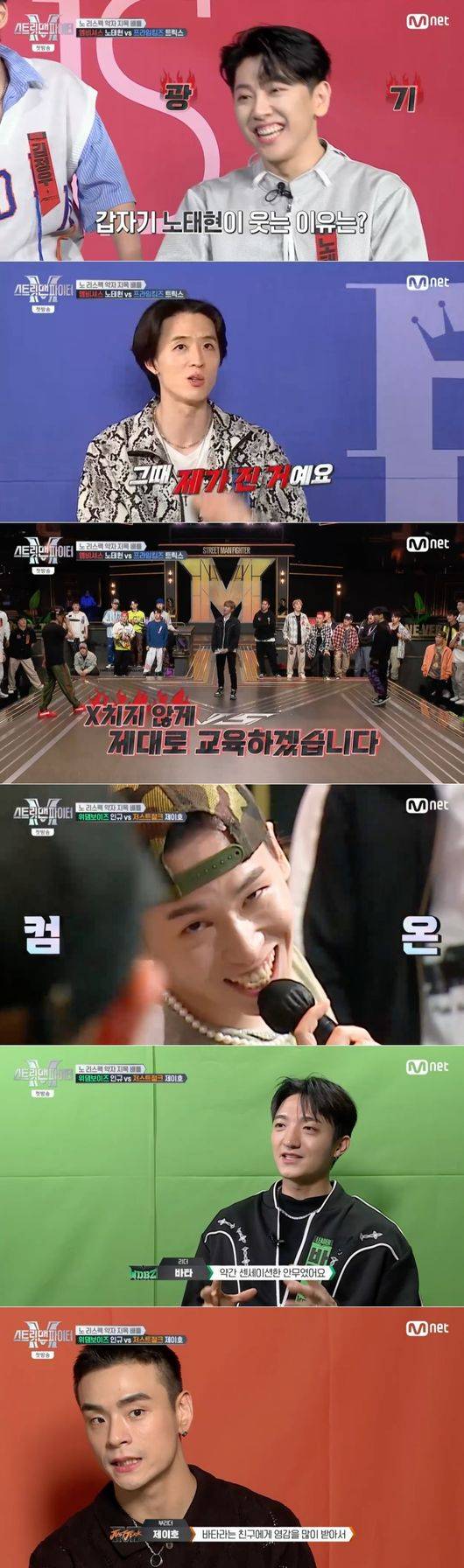 가장 먼저 배틀 첫 주자로 나선 것은 엠비셔스의 노태현. 그가 '노 리스펙' 약자로 지목한 건 바로 크럼프 전문 댄서인 프라임 킹즈의 리더 트릭스. 과거 같은 팀에 있기도 했던 두 사람은 '노력형' 댄서에서 크럼프 세계 챔피언까지 됐던 트릭스 그리고 '천재형' 댄서에서 아이돌 가수로도 활동했던 노태현의 만남으로 기대를 모았다.