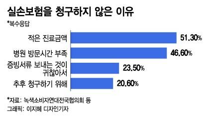 그러나 실손보험에 가입한 국민 2명 중 1명은 청구하면 받을 수 있는 보험금을 포기하는 것으로 나타났다. 지난해 녹색소비자연대전국협의회 등 시민단체들의 조사 결과, 실손보험 가입자 중 47.2%가 진료를 받고도 실손보험 청구를 하지 않았다.