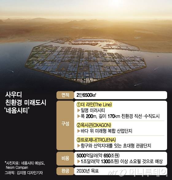 네옴시티는 사우디 북서부 시나이반도 인근에 조성되는 친환경 미래도시로, 사우디 실권자 무함마드 빈 살만 왕세자가 추진하는 사회변혁 프로젝트 '비전 2030' 일환으로 추진됐다. 2030년 완공을 목표로 하며 사업비만 5000억달러(약 650억원) 이상 투입된다. 완공을 위해선 1조달러(약 1300조원)가 투입돼야 한다는 관측도 있다.